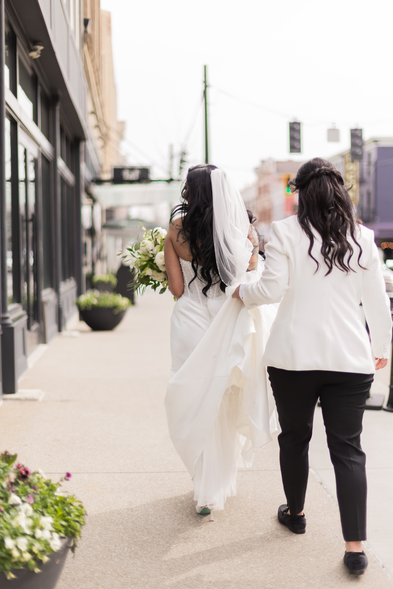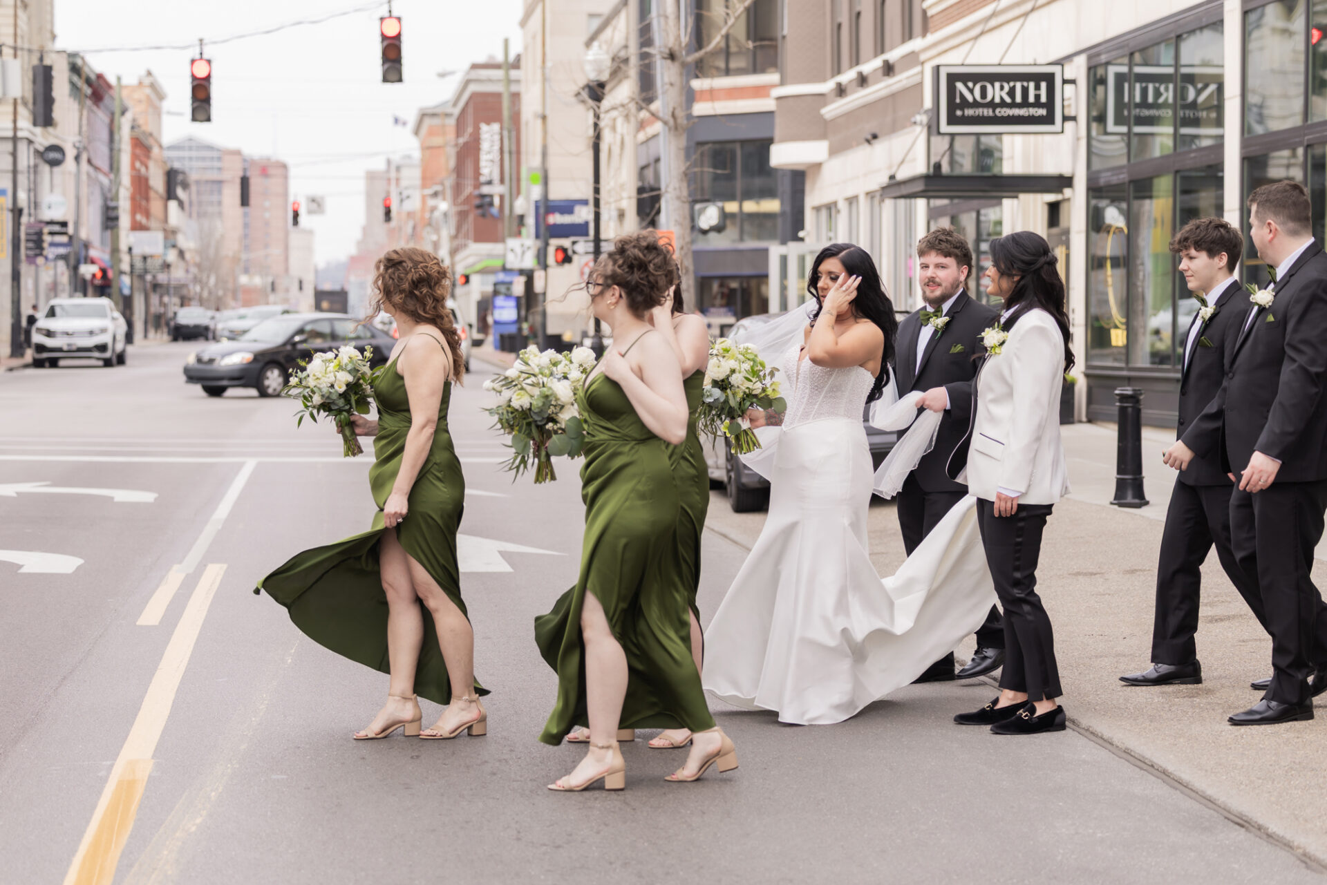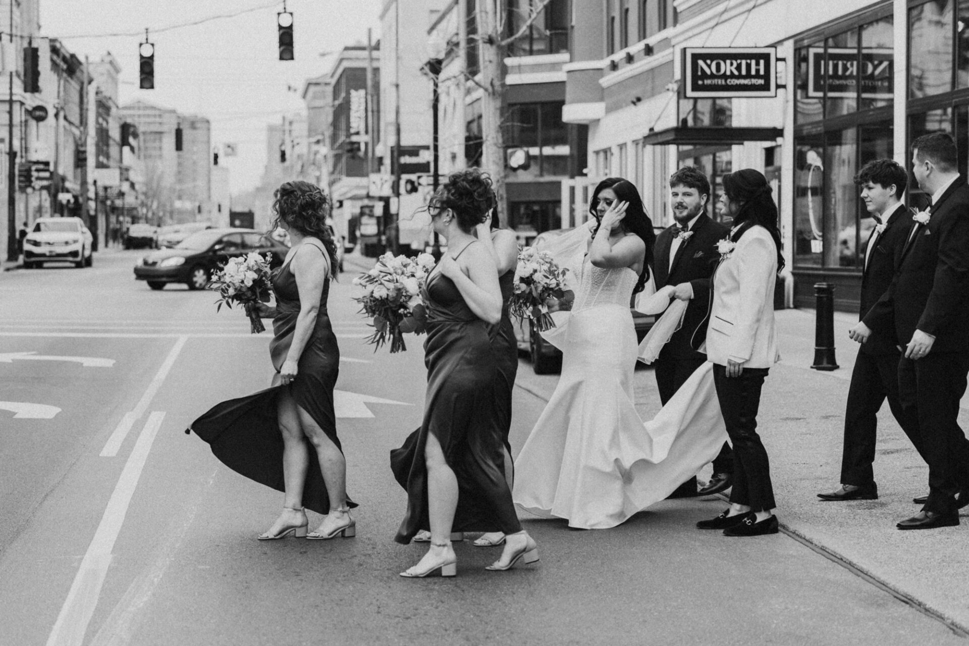 Afterward, we spent time with Derrica and Molly for more portraits, just the two of them. Out in the streets and in front of Hotel Covington, the focus stayed on their connection, letting each moment unfold naturally while still feeling elevated and beautiful.