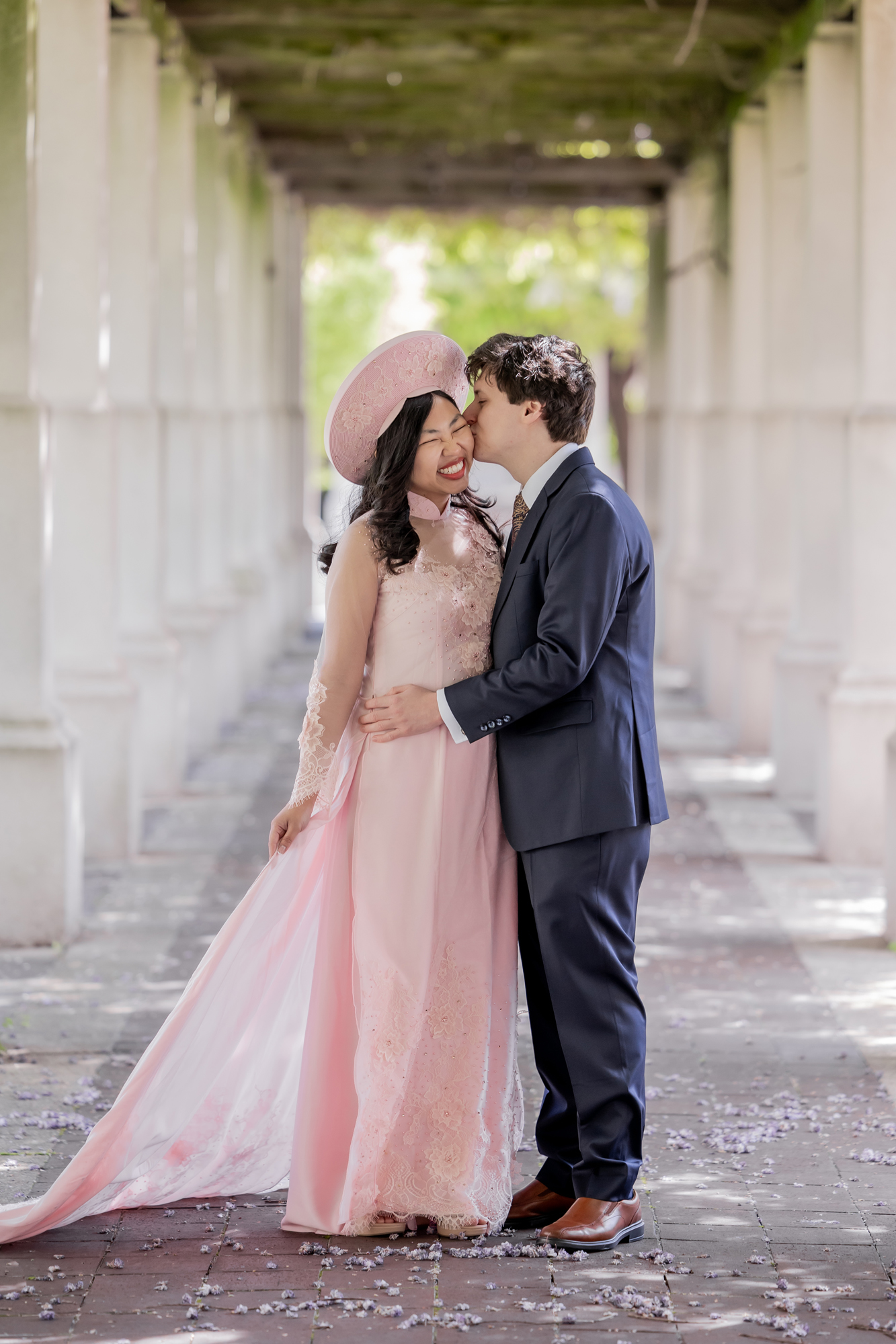 Jennifer wore a beautiful traditional Vietnamese Ao Dai in the softest shade of pink, with intricate lace detailing that added a touch of timeless elegance. Robert looked equally sharp in a navy blue suit that complimented her look effortlessly. Together, they were a vision—elegant, playful, and clearly so in love.